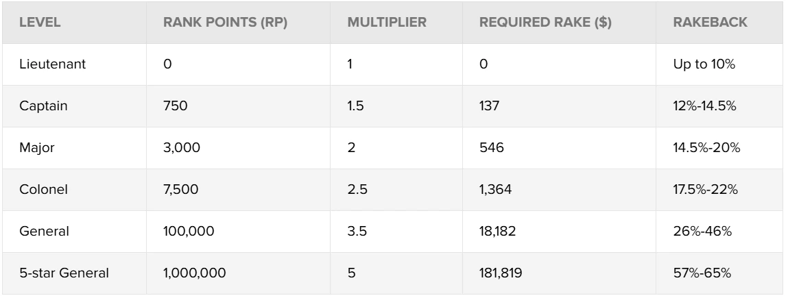 27% fixe ou jusqu'à 65% via Elite Benefits (progressif, 5.5 points = 1$ rake). + Rake Races (The Beast : 50-500$ cash/semaine).